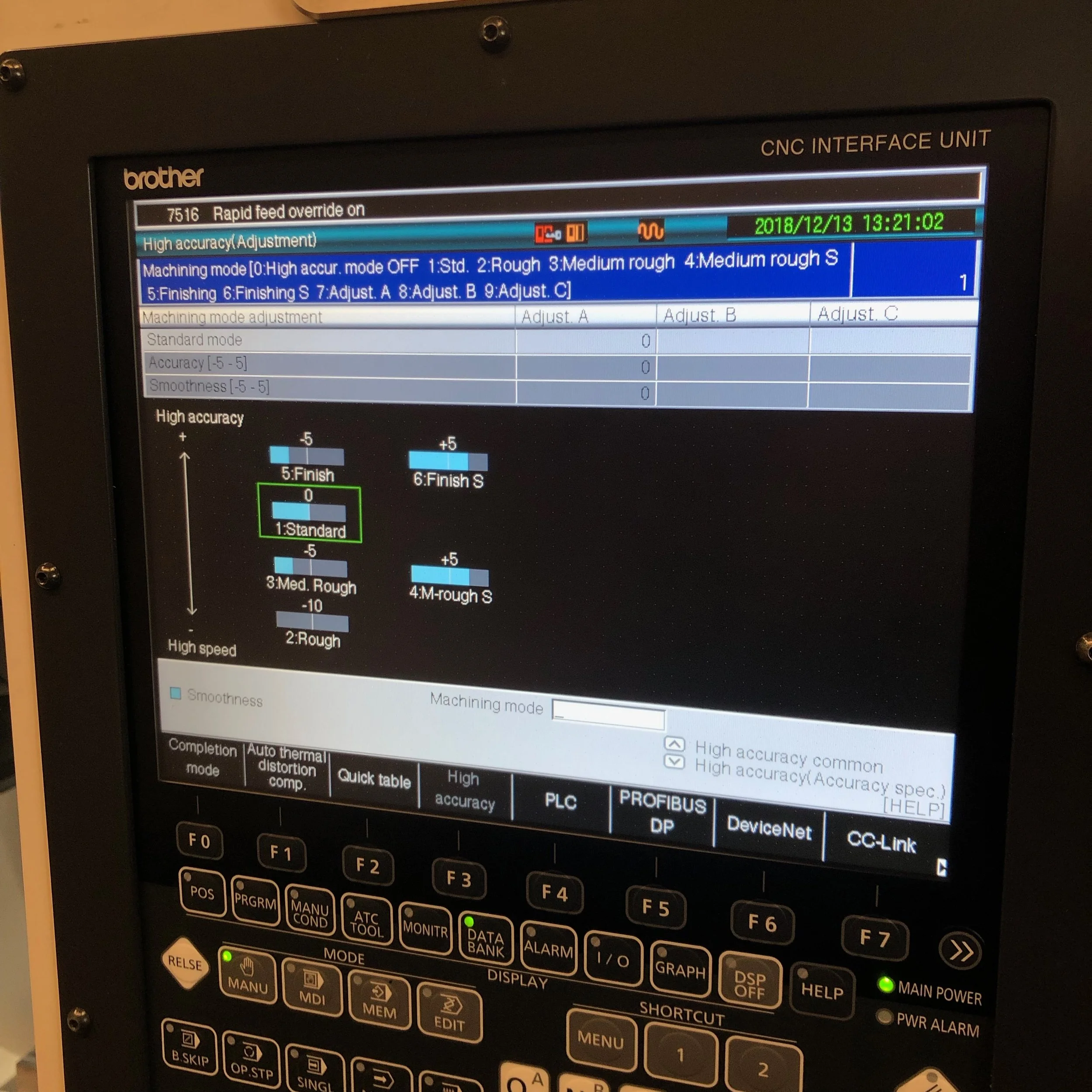 Brother’s original High Accuracy interface has been a bit of a sticking point as these machines have gained popularity amongst the unique needs of the US market. Where Haas mills, Robodrills, and Okuma machines automate and simplify the application of their code smoothing technologies, High Accuracy’s unique focus on deep configurability for a specific application makes the system a complex hinderance in quick-turn environments.